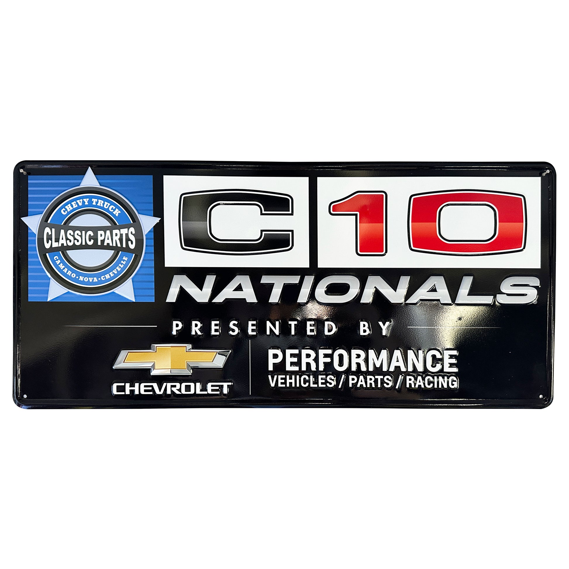 The ClassicParts.com C10 Nationals presented by Chevrolet Performance Official Sign. Measures 23.5" x 10.75" aluminum and is .024 thick and embossed.