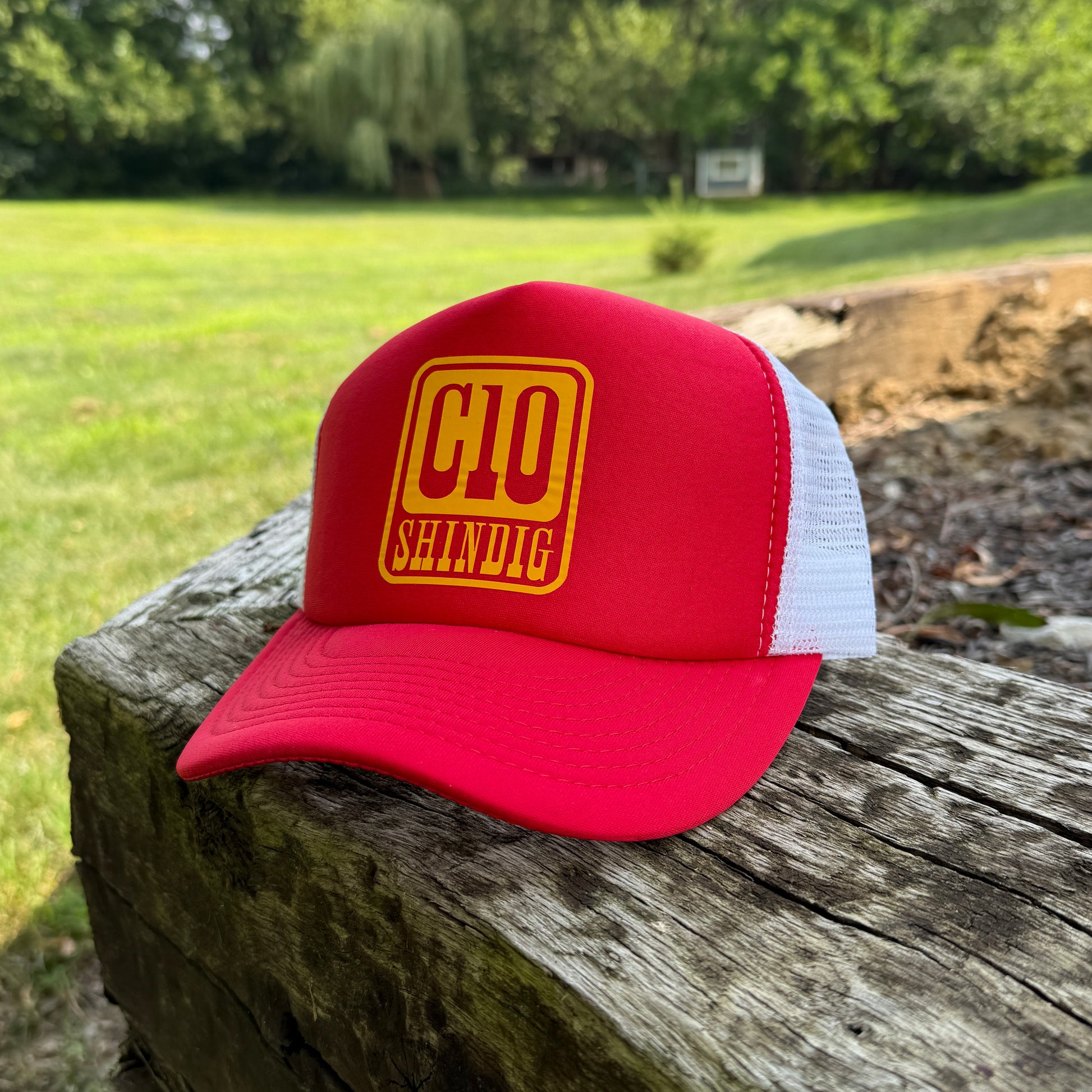 C10 Shindig® logo centered on a red hat with white mesh & gold logo snap back hat.